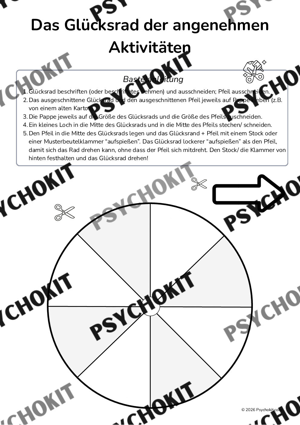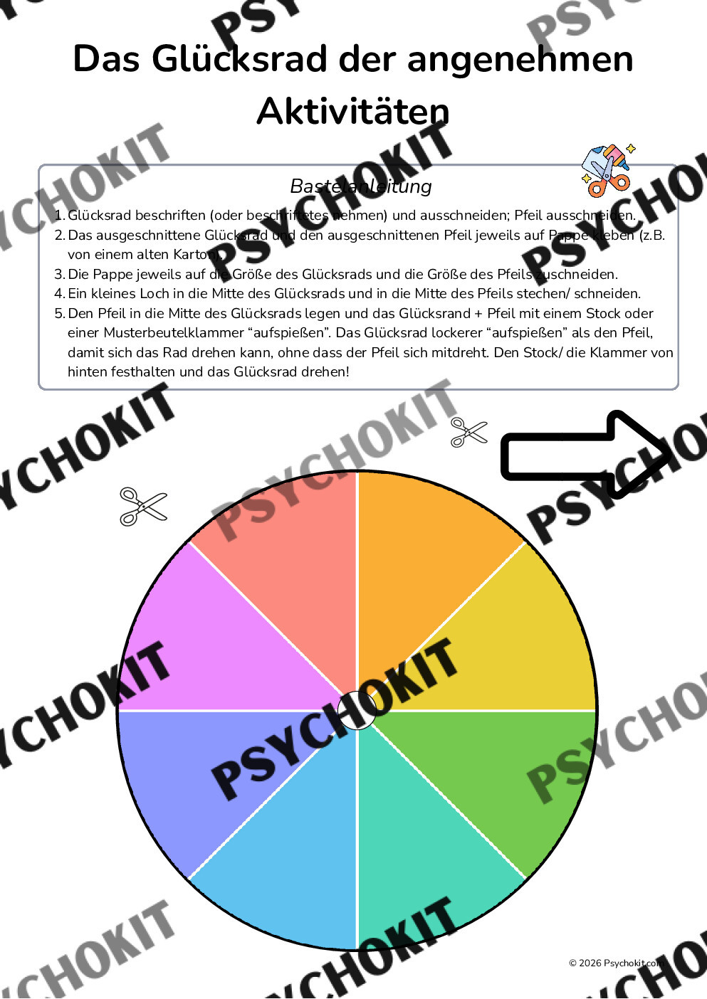Aktivitätsaufbau und Verhaltensaktivierung ist ein essentieller Bestandteil vieler Therapien, doch oft fehlt im Alltag für viele Klient*innen der Impuls oder die Idee, was sie konkret tun können. Dieses Glücksrad der angenehmen Aktivitäten bringt Leichtigkeit und Kreativität in die Verhaltensaktivierung. Schon das Basteln selbst ist eine wunderbare, positive Erfahrung und macht Spaß!