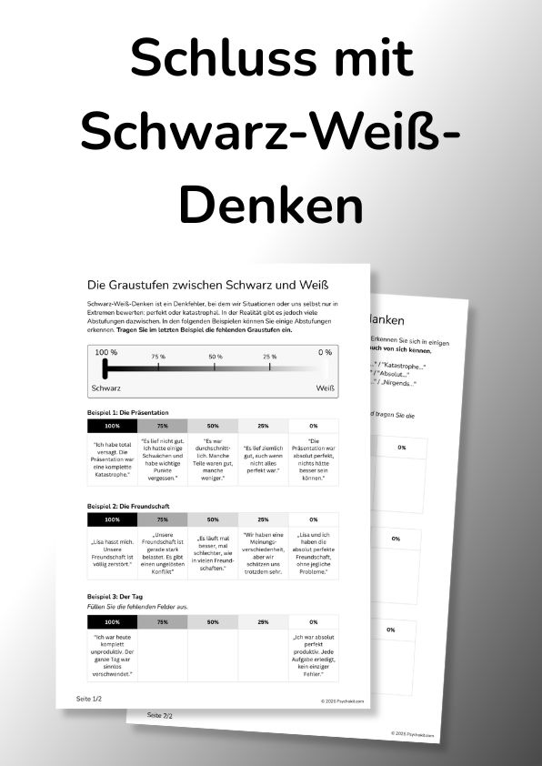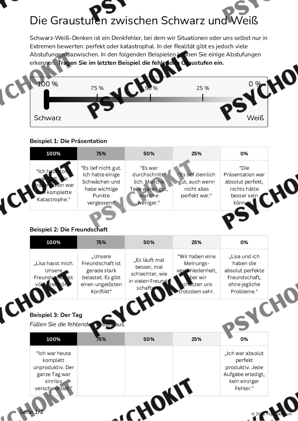 Version 1 (2 Seiten): Psychoedukation mit mehreren vorausgefüllten Beispielen sowie mit Feldern für die Bearbeitung mehrerer eigener Schwarz-Weiß-Gedanken.